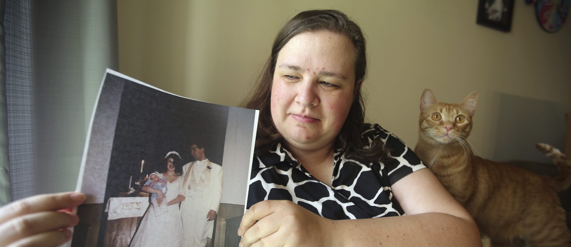 Heidi Clark holds a photograph from her 1995 wedding at her home in Orem, Utah, on Friday, May 18, 2018. Clark became pregnant at 16 and married soon after, under pressure from her boyfriend's religious community of Seventh-Day Adventists in Pennsylvania, she said. “I always felt a little bit like I was trapped,” Clark said, now 40. “I was 17. I was so young.”
